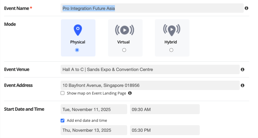 The Mode of your event can be Physical or Virtual or Hybrid. The Venue input fields will change based on the Mode.