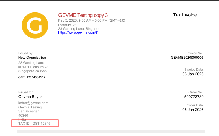 Gevme’s invoicing system has traditionally used a fixed structure to maintain consistency and clarity across all event transactions. However, we recognize that event organisers and their buyers often require additional custom fields—especially tax-related details—to be included on invoices. To address this need, Gevme now supports adding custom tax fields into invoices through a simple, standardized naming convention.